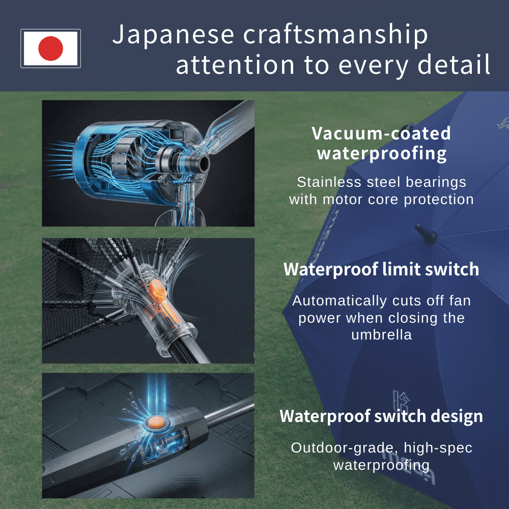 Smart Safety Protection: Exclusively designed with a “waterproof limit switch” that automatically cuts off fan power when closing the umbrella, preventing accidental injury and protecting the umbrella frame.